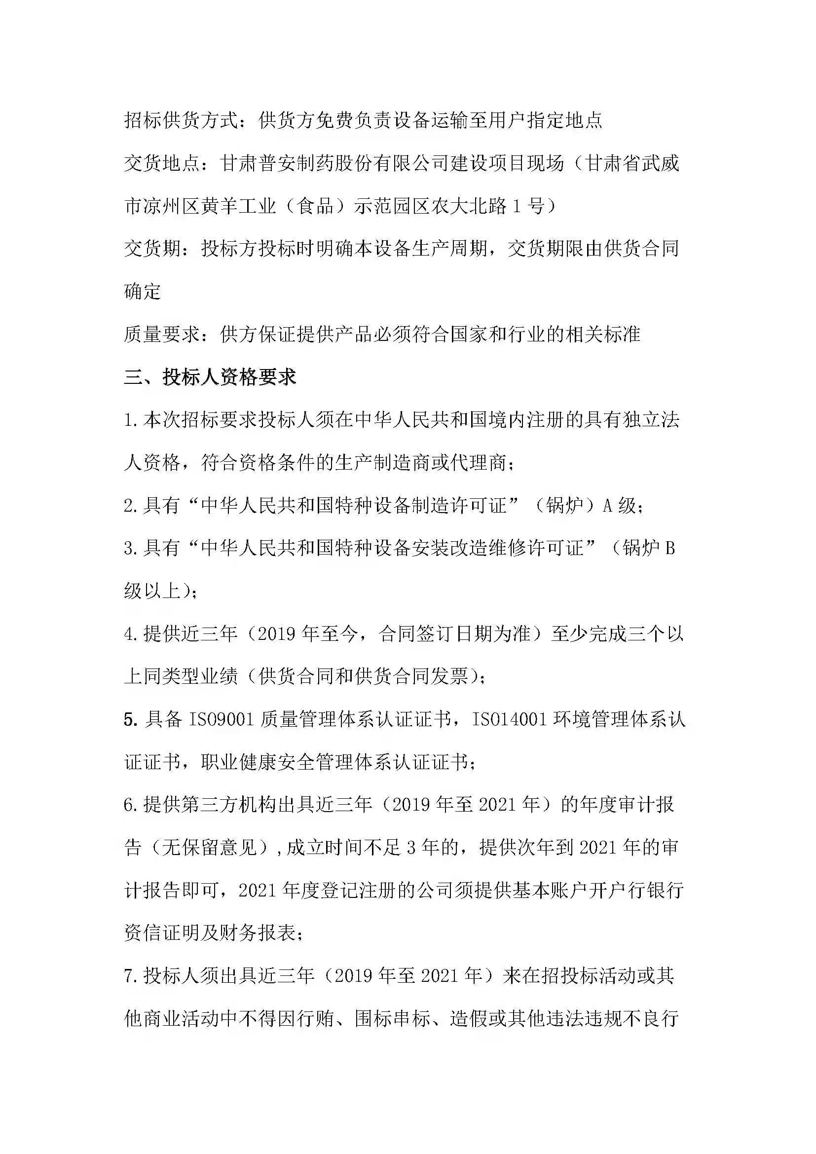 甘肅普安制藥股份有限公司15T/h鍋爐建設項目鍋爐設備采購招標公告