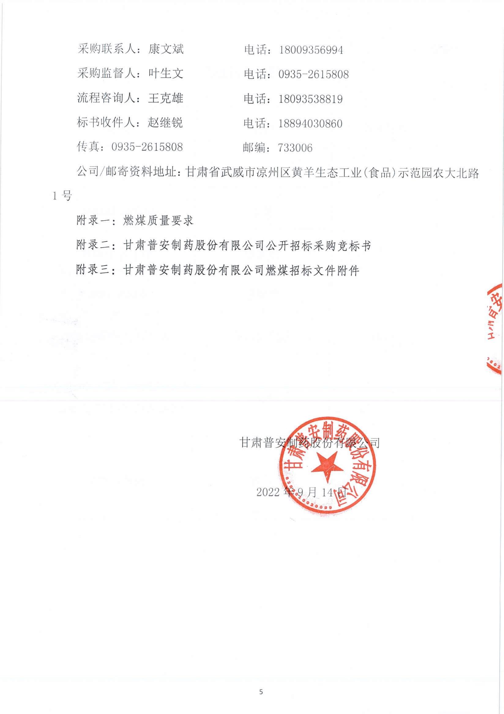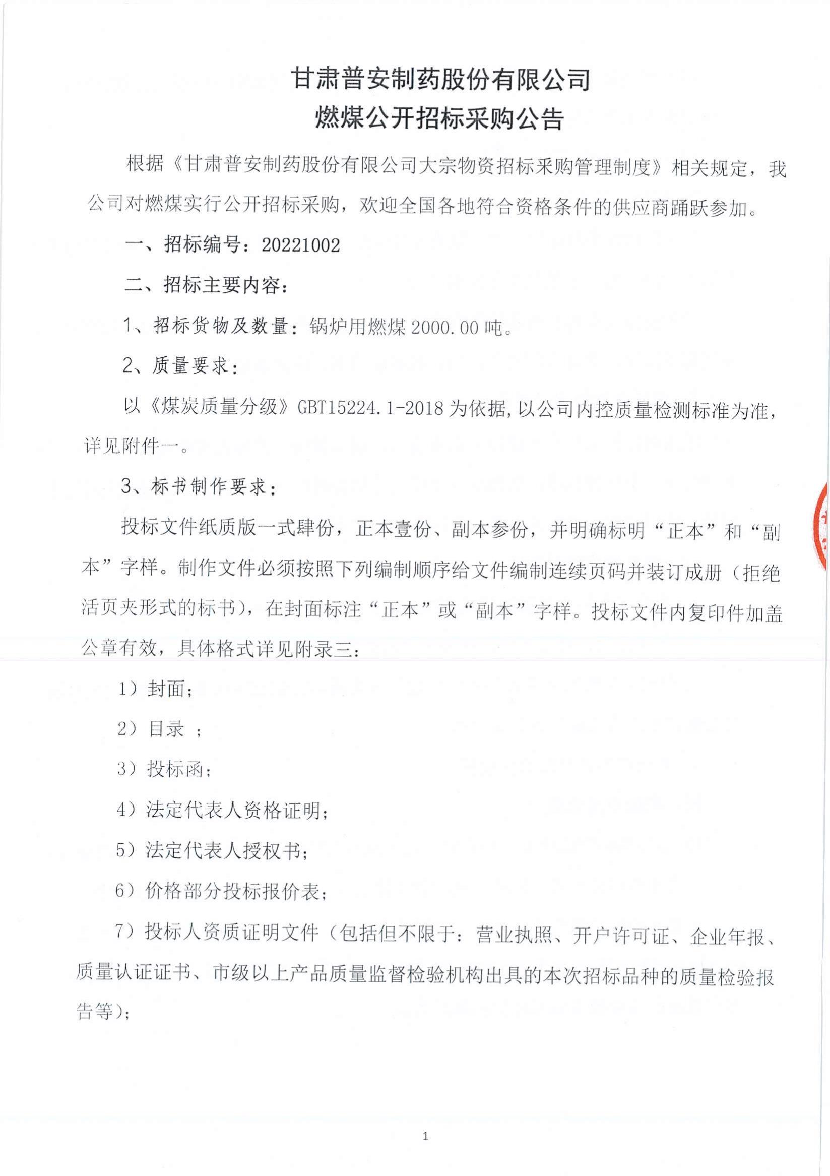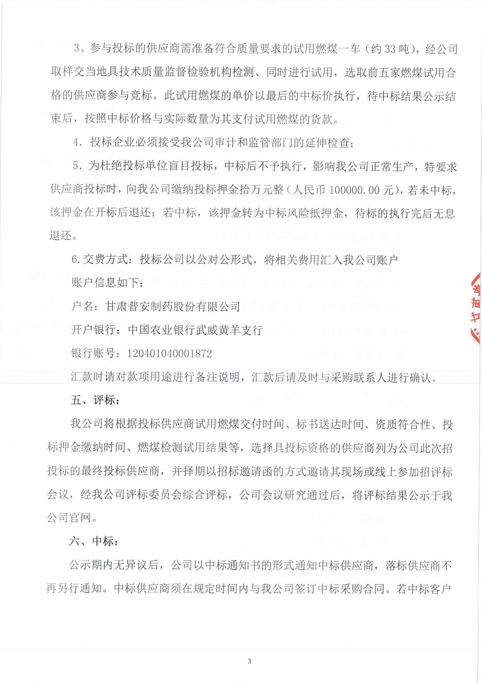 甘肅普安制藥股份有限公司燃煤公開招標(biāo)采購公告