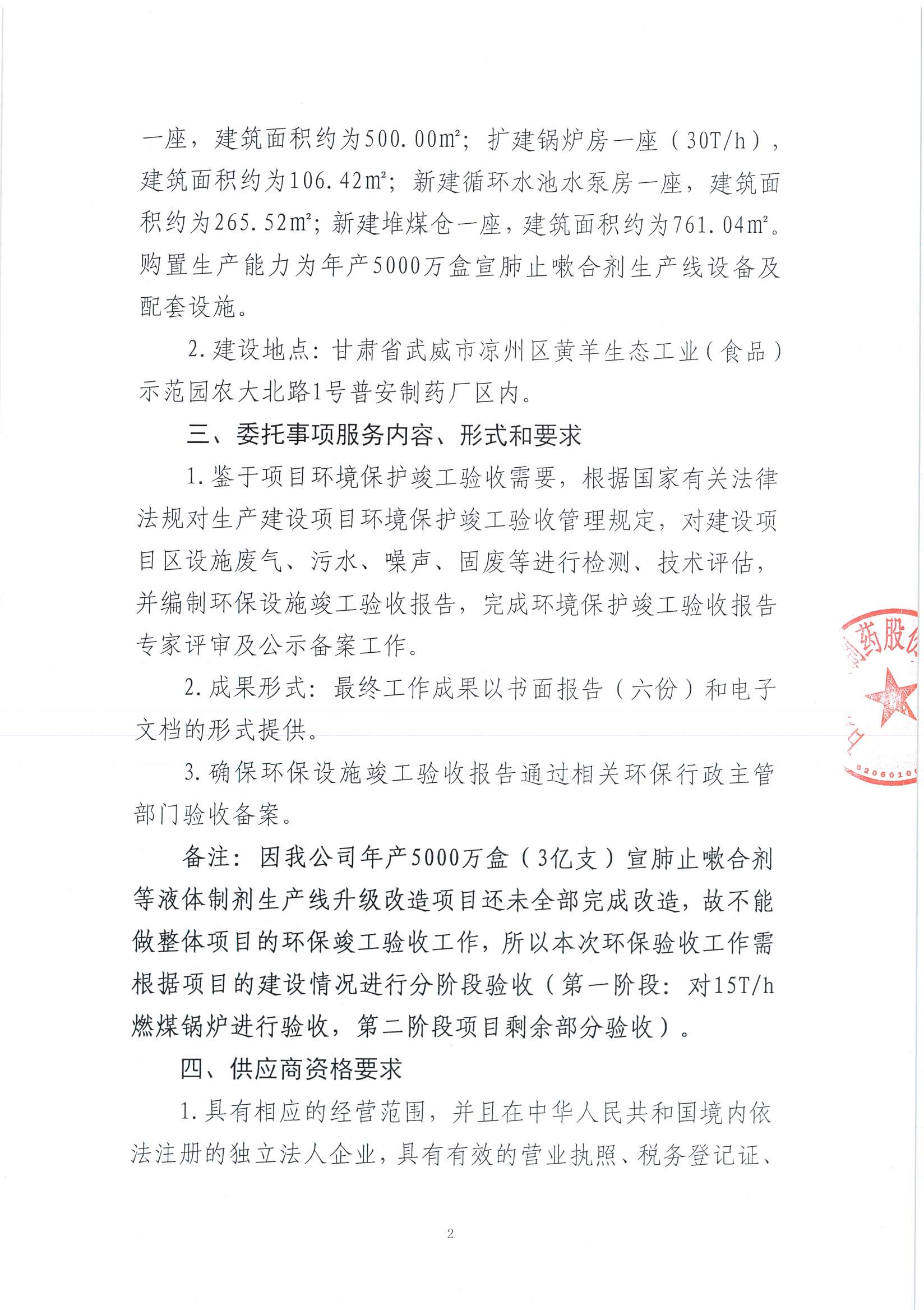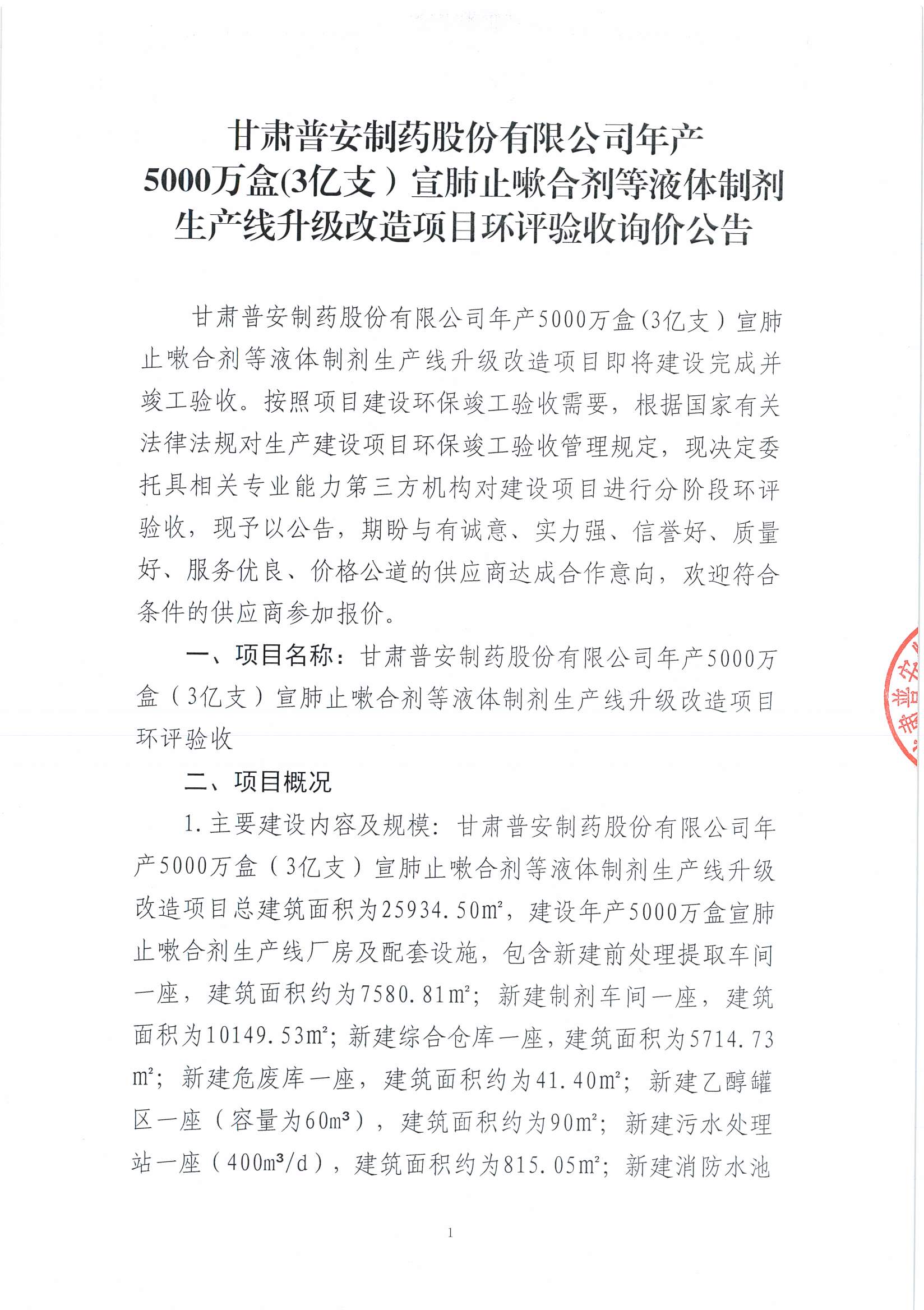 甘肅普安制藥股份有限公司年產5000萬盒(3億支)宣肺止嗽合劑等液體制劑生產線升級改造項目環評驗收詢價公告