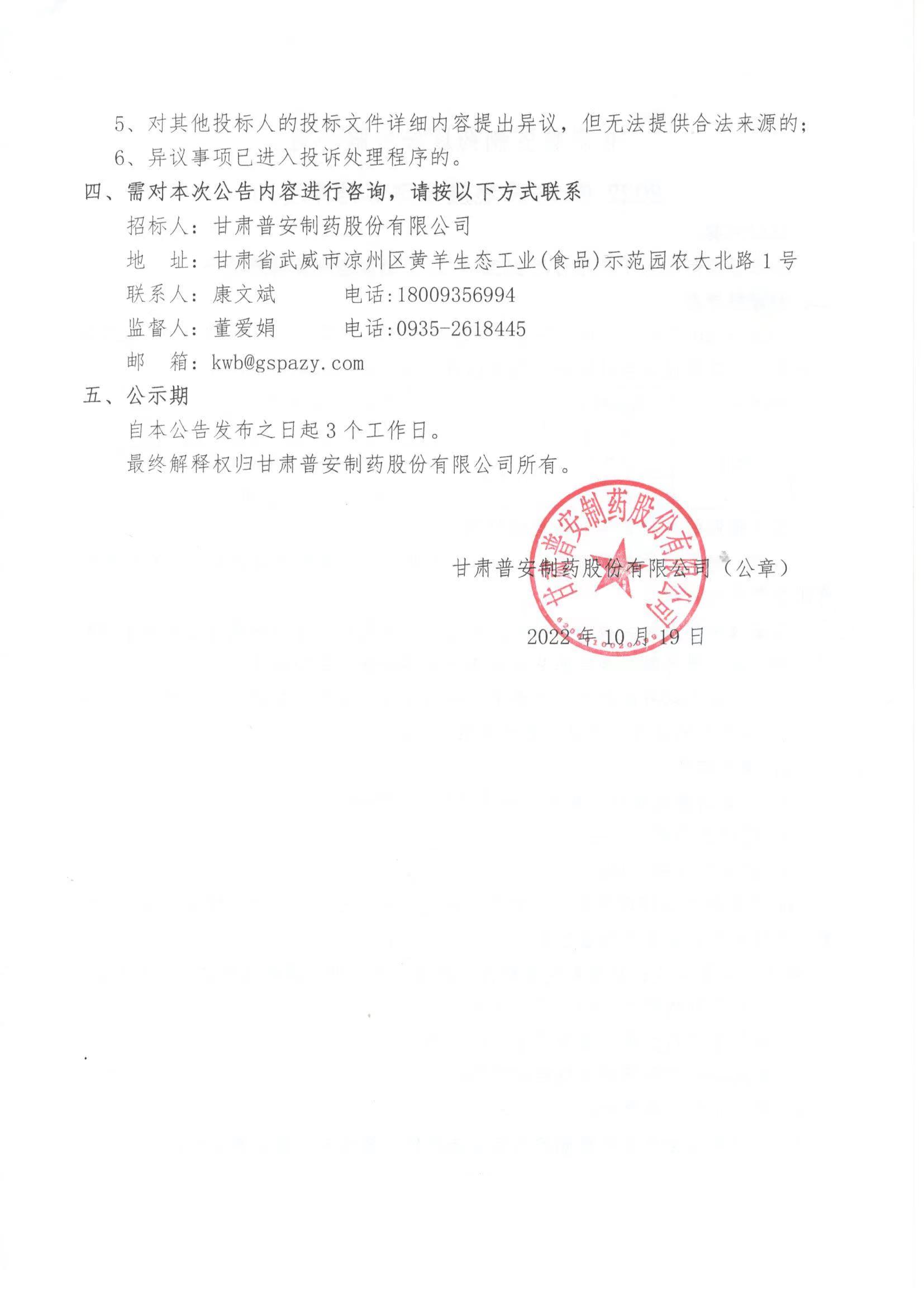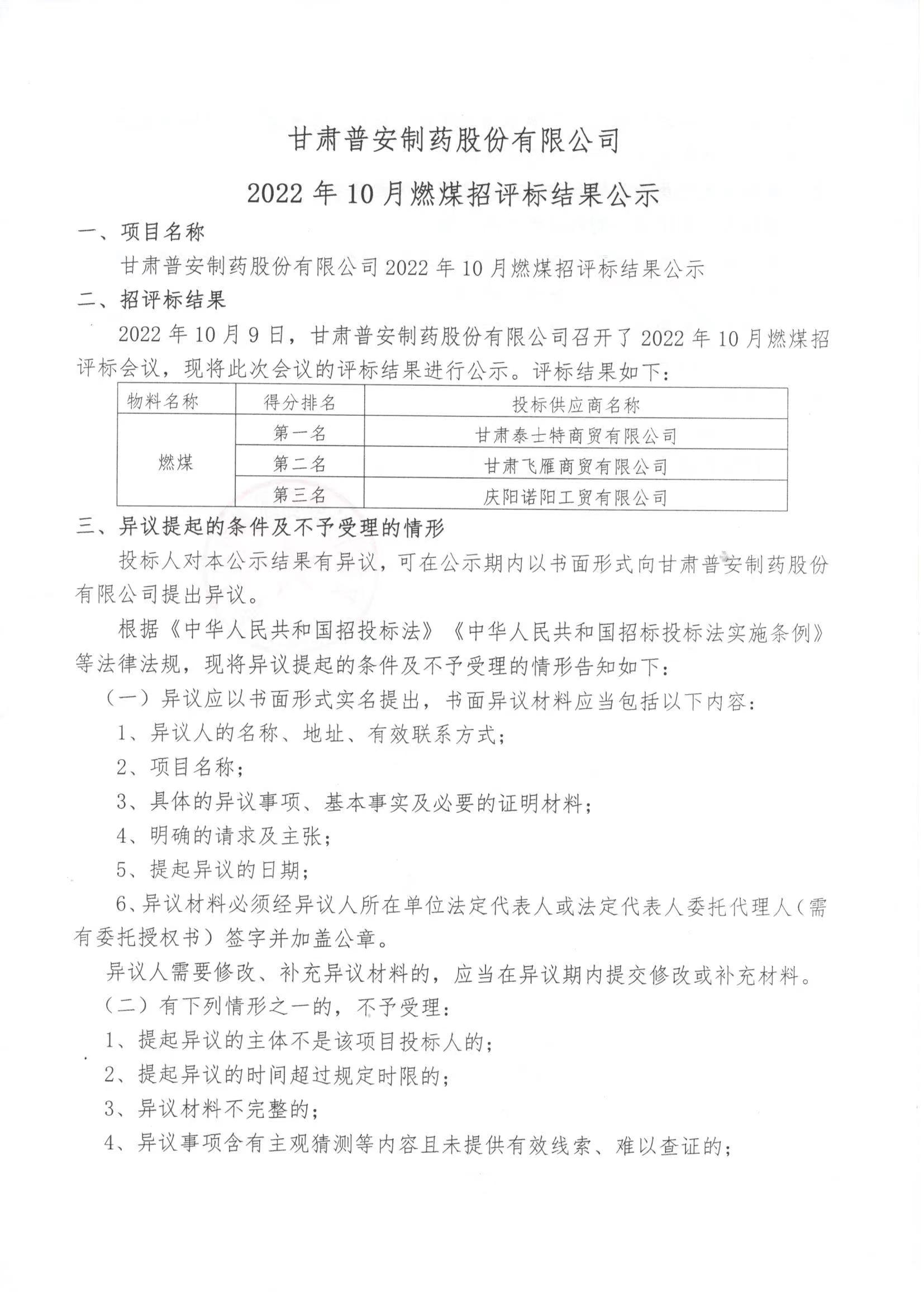 甘肅普安制藥股份有限公司2022年10月燃煤招評(píng)標(biāo)結(jié)果的公示
