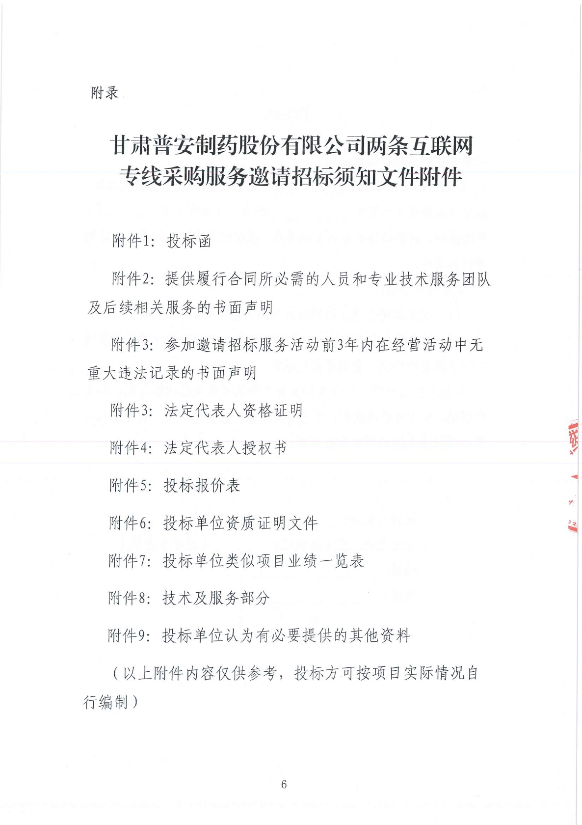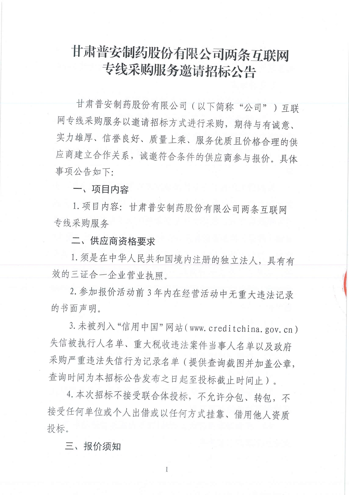 甘肅普安制藥股份有限公司兩條互聯網專線采購服務邀請招標公告